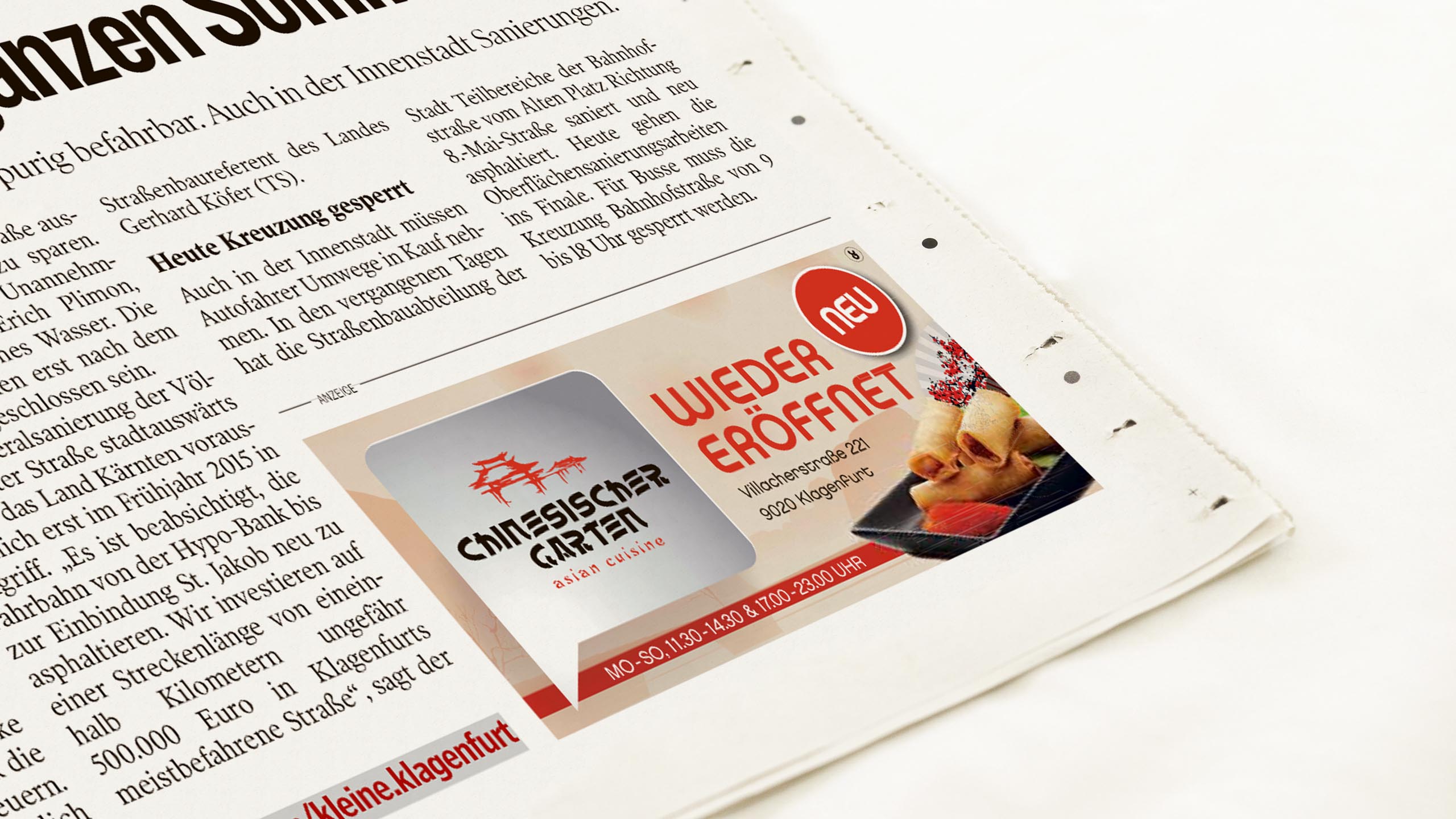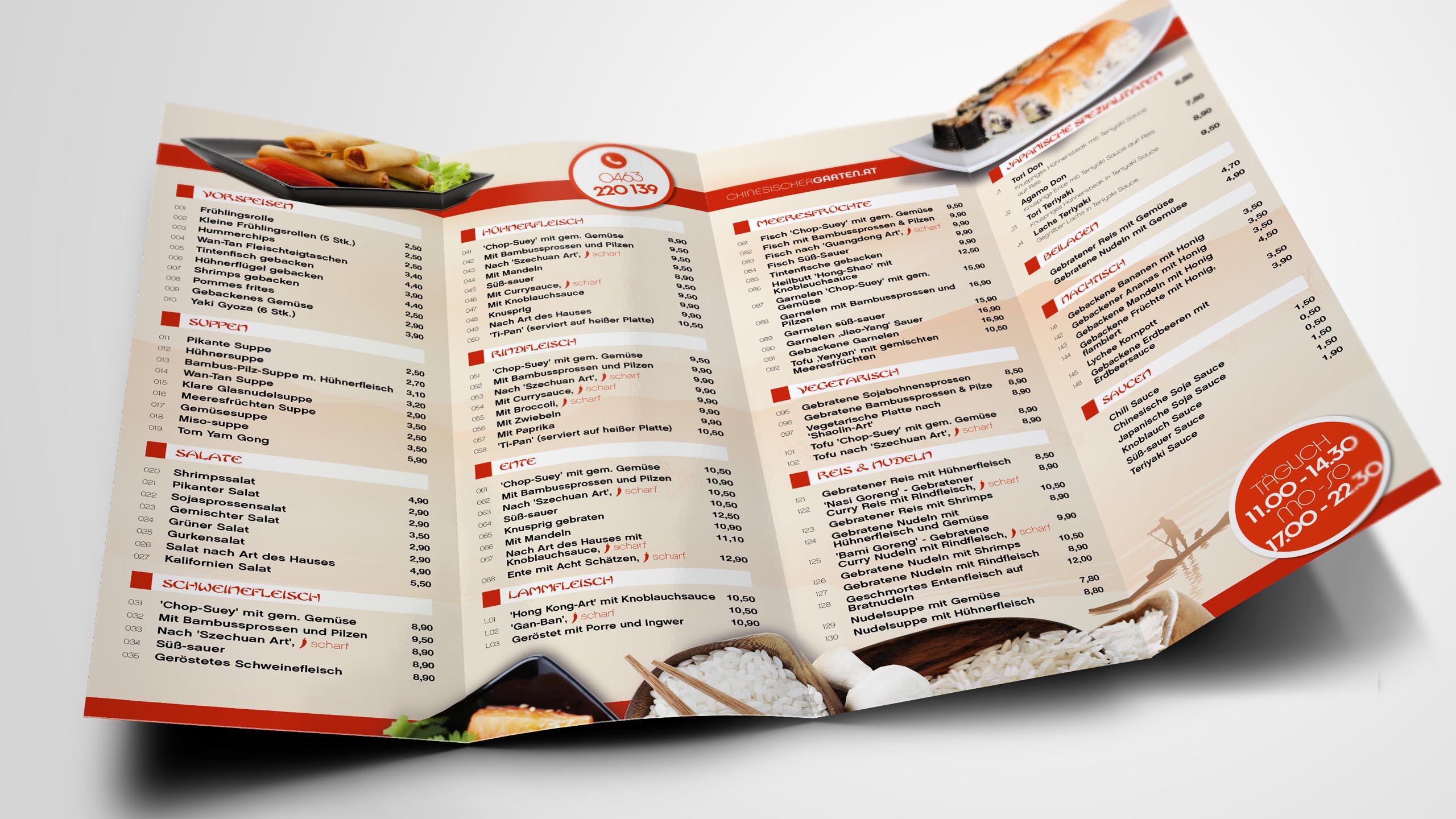der chinesische garten gehört seit über 20 jahren im klagenfurter univiertel und in der stadt zu einem der beliebten china-restaurants. im jahr 2014 wurde das angebot um sushi und asiatische spezialitäten erweitert und man nahm auch den lieferservice ins programm mit auf.