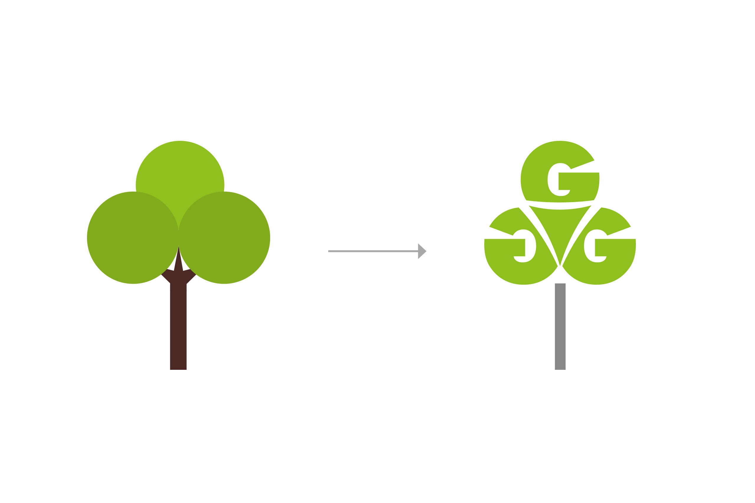 die bildmarke im logo zeigt einen baum, dessen krone den buchstaben G drei mal beherbergt. eine anspielung auf die initialen der firmengründer sowie referenz an das doppel-g im firmenwortlaut mit den beiden nach rechts schauenden buchstaben. ein schlichtes und geradeliniges design zieht sich in folge durch alle geschäftsdrucksorten sowie produktbroschüren und preislisten.